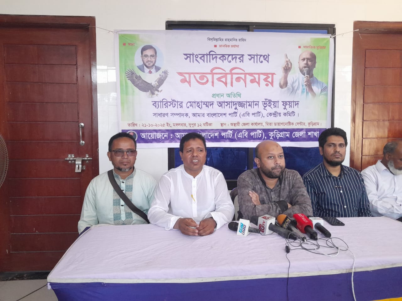 আমার বাংলাদেশ পাটির (এবি পার্টি) উদ্যোগে কুড়িগ্রামে সাংবাদিকদের সাথে মতবিনিময় সভা অনুষ্ঠিত হয়েছে। গতকাল মঙ্গলবার দুপুরে শহরের সবুজপাড়া এলাকায় পার্টির অস্থায়ী কার্যালয়ে অনুষ্ঠিত মতবিনিময় সভায় প্রধান অতিথি হিসেবে উপস্থিত ছিলেন এবি পাটির কেন্দ্রীয় সাধারণ সম্পাদক ব্যারিস্টার মোহাম্মদ আসাদুজ্জামান ভূঁইয়া ফুয়াদ।