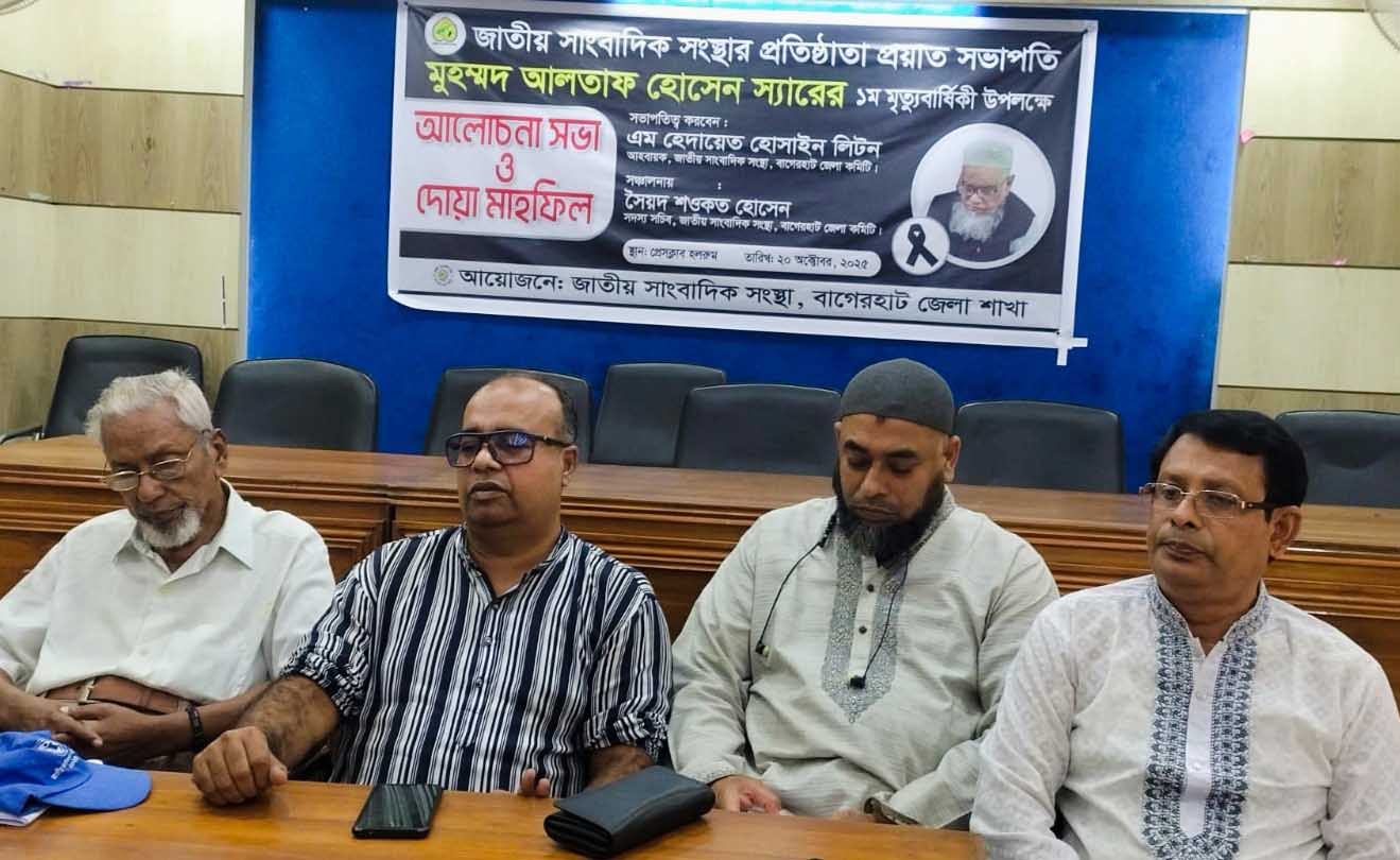 জাতীয় সাংবাদিক সংস্থা’র প্রতিষ্ঠাতা ও প্রায়ত সভাপতি মুহম্মদ আলতাফ হোসেনের প্রথম মৃত্যুবার্ষিকী উপলক্ষে গতকাল সোমবার (২০ অক্টোবর) দুপুরে জাতীয় সাংবাদিক সংস্থা’ বাগেরহাট জেলা শাখার উদ্যোগে প্রেসক্লাবের হলরুমে আলোচনা সভা ও দোয়া মাহফিল অনুষ্ঠিত হয়েছে। জাতীয় সাংবাদিক সংস্থা’র জেলা শাখার আহ্বায়ক এম হেদায়েত হোসাইন লিটনের সভাপতিত্বে ও সদস্য সচিব সৈয়দ শওকত হোসেনের সঞ্চালনায় অনুষ্ঠিত সভায় প্রধান অতিথি হিসেবে উপস্থিত ছিলেন বাগেরহাট প্রেসক্লাবের সাবেক সভাপতি অধ্যাপক এ বি এম মোশাররফ হোসাইন। বিশেষ অতিথি হিসেবে উপস্থিত ছিলেন বাগেরহাট প্রেসক্লাবের সাধারণ সম্পাদক তরফদার রবিউল ইসলাম । সভায় অন্যান্যদের মধ্যে ছিলেন কেন্দ্রীয় কমিটির সাবেক সহকারী মহা সচিব শেখ আবু সাঈদ,জেলা শাখার সাবেক সভাপতি মোল্লা আব্দুর রব, সহ-সভাপতি এস এম রাজ, প্রেসক্লাবের অর্থ সম্পাদক মোল্লা মাসুদুল হক, সদস্য ফকির হাসান আলী,আরিফুল ইসলাম, সোহেল রানা বাবু, সাংবাদিক নকিব মিজানুর রহমান মোঃ সাগর প্রমূখ । সভা ও দোয়া মাহফিলে আলতাফ হোসেনের রুহের মাহফিরাত এবং সারা দেশে আরো মৃত্যু হওয়া সাংবাদিকদের মাগফিরাত ও সকল সাংবাদিকসহ দেশ ও জাতির কল্যাণ কামনা করে বিশেষ মোনাজাত করা হয়। মোনাজাত পরিচালনা করেন প্রেসক্লাবের সাধারণ সম্পাদক তরফদার রবিউল ইসলাম ।