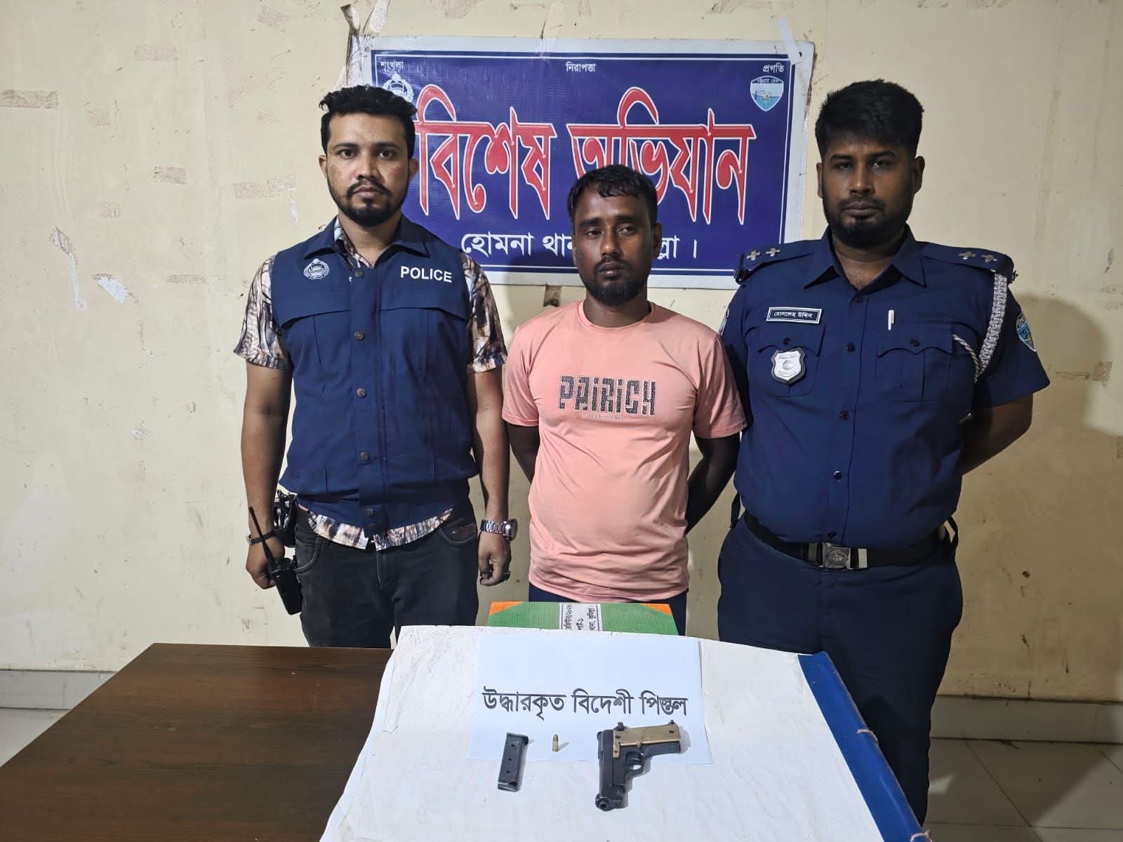 হোমনায় বিদেশি পিস্তল ও গুলিসহ যুবক গ্রেপ্তার