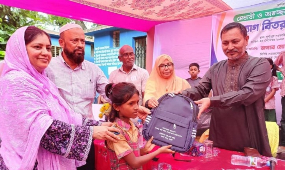 নওগাঁয় মেধাবী ও অস্বচ্ছল শিক্ষার্থীদের মাঝে স্কুল ব্যাগ বিতরণ