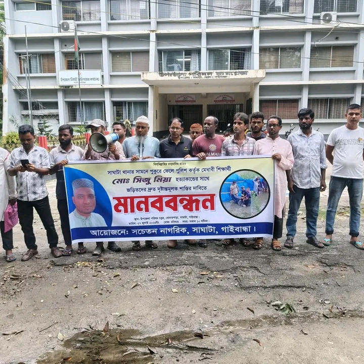 গাইবান্ধার সাঘাটা থানায় সিজু হত্যাকান্ডের ঘটনায় বিচারের দাবিতে মানববন্ধন