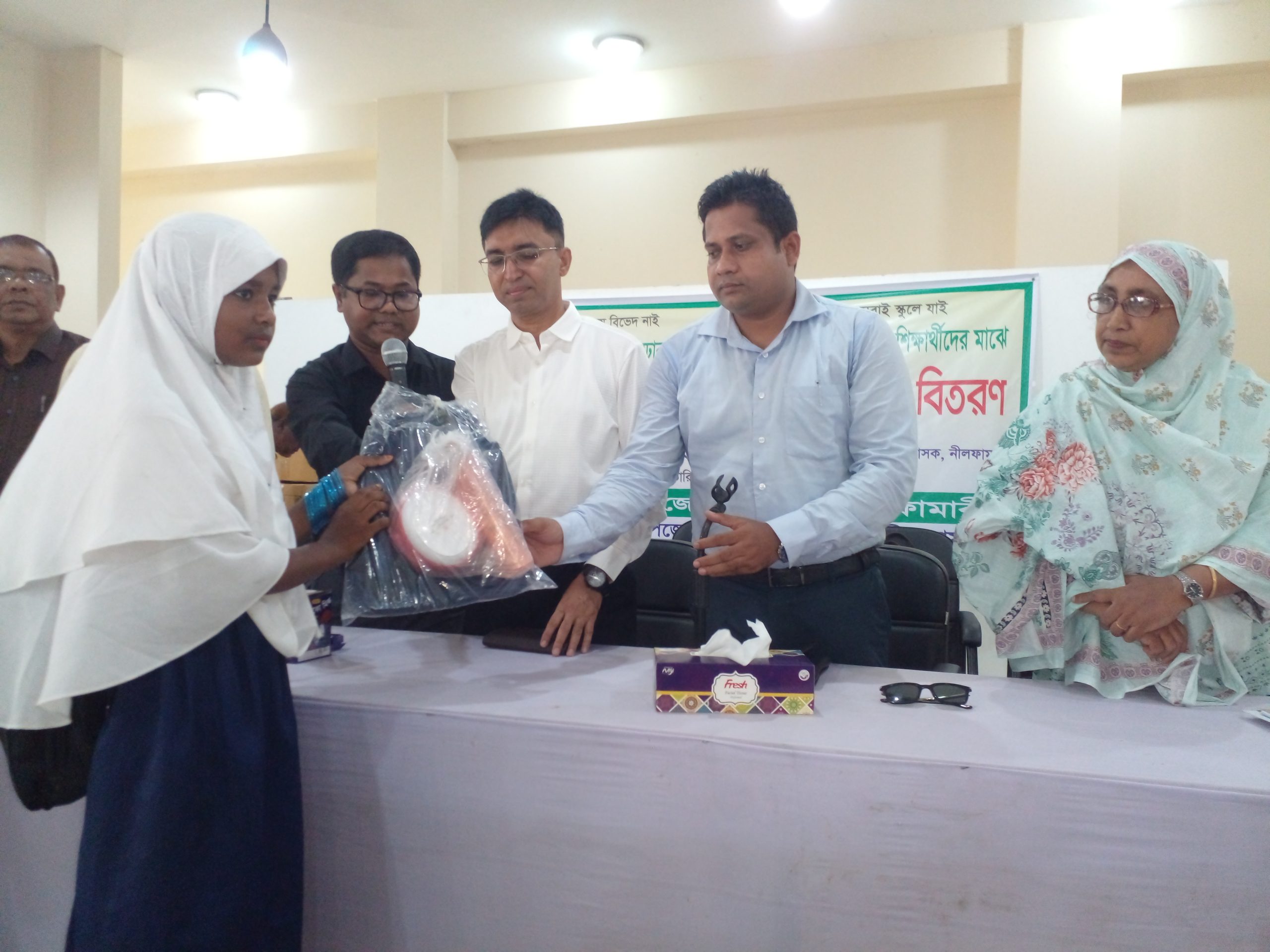জলঢাকায় প্রাথমিক শিক্ষার্থীদের মাঝে স্কুল ব্যাগ টিফিন বক্স পানির পাত্র বিতরণ