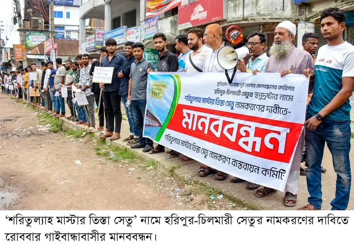 হরিপুর-চিলমারী সেতু শরিতুল্যাহ মাস্টার তিস্তা সেতু নামকরণের দাবিতে সুন্দরগঞ্জ বাসীর মানববন্ধন