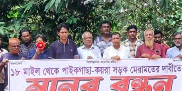পাইকগাছা-কয়রা সড়ক মেরামতের দাবিতে মানববন্ধন ও বৃক্ষরোপণ কর্মসূচি