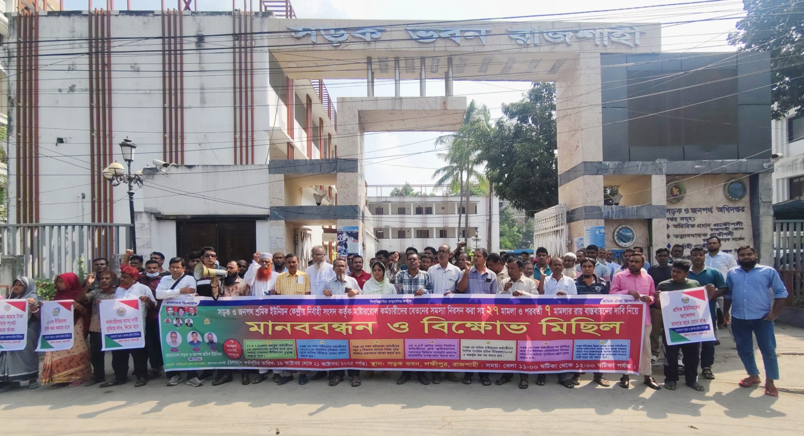 রাজশাহীতে ৭ দফা বাস্তবায়নে সওজ কর্মচারীদের মানববন্ধন