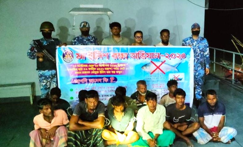 চাঁদপুরের কোস্টগার্ড ও মৎস্য অধিদপ্তরের অভিযানে কারেন্ট জাল ও বোটসহ আটক ১১