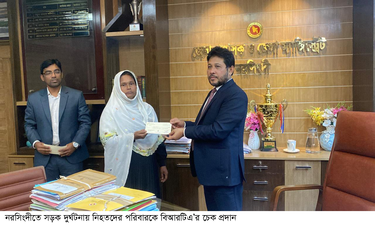 নরসিংদীতে দুর্ঘটনায় নিহতদের পরিবারকে বিআরটিএ’র চেক প্রদান