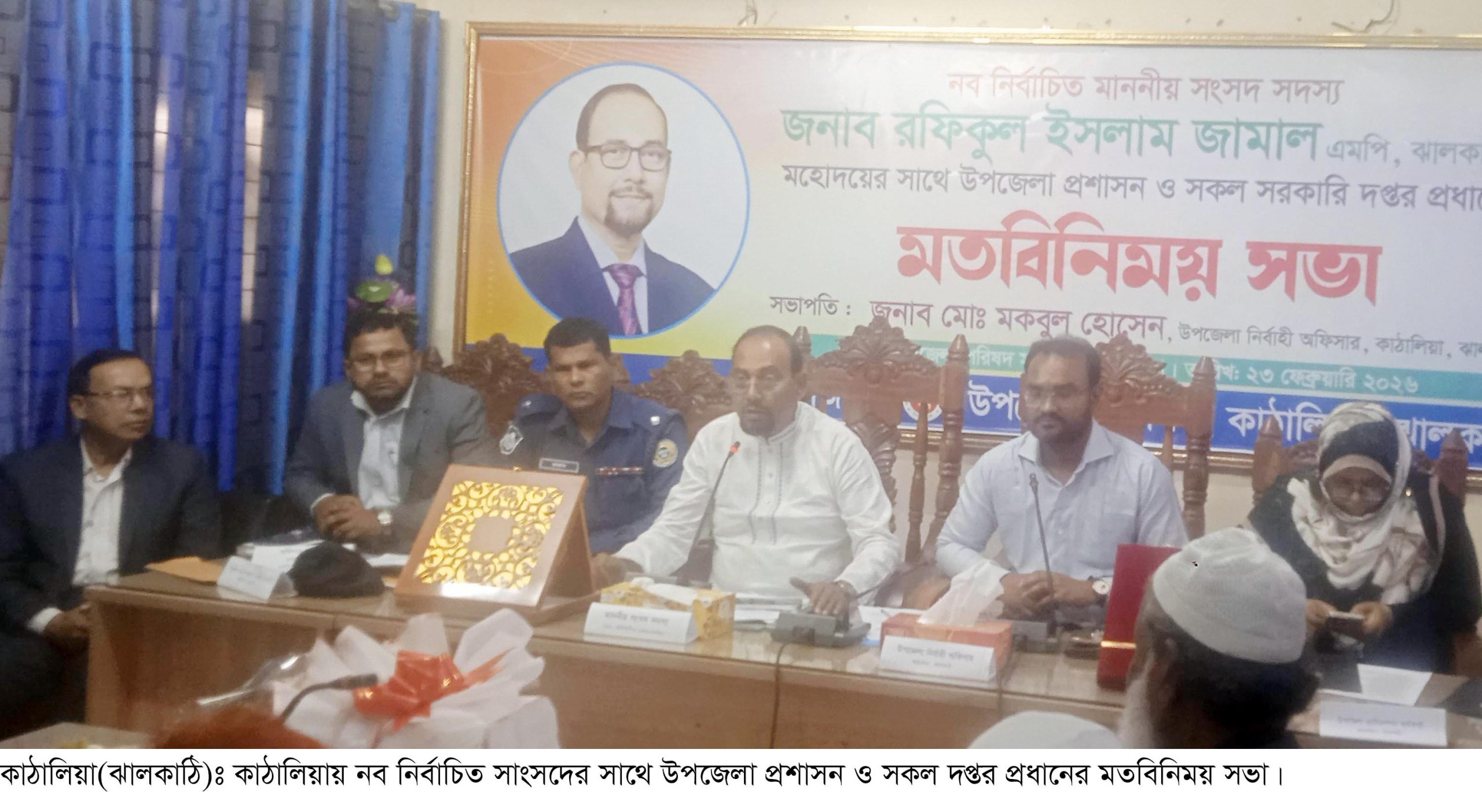 ঝালকাঠির কাঠালিয়ায় ঝালকাঠি-১(কাঠালিয়া-রাজাপুর) আসনের নবনির্বাচিত সংসদ সদস্যের সাথে উপজেলা প্রশাসন ও সকল সরকারি দপ্তর প্রধানের এক মতবিনিময় সভা অনুষ্ঠিত হয়েছে।