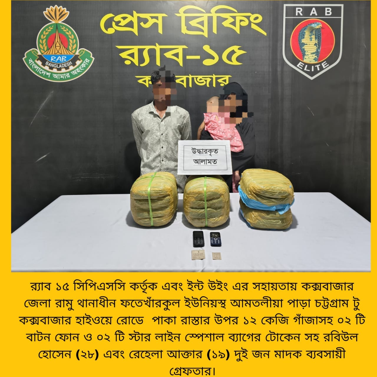কক্সবাজারের রামুতে র্যাব-১৫ এর বিশেষ অভিযানে ১২ কেজি গাঁজাসহ এক দম্পতিকে আটক করা হয়েছে। গতকাল শনিবার রামু ফুটবল চত্বর এলাকায়