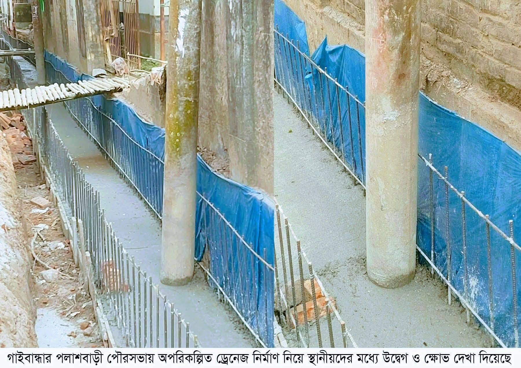 গাইবান্ধার পলাশবাড়ী পৌরসভায় অপরিকল্পিত ড্রেনেজ নির্মাণ নিয়ে স্থানীয়দের মধ্যে উদ্বেগ ও ক্ষোভ দেখা দিয়েছে। চৌমাথা মোড় থেকে গোয়ালপাড়া পর্যন্ত নির্মাণাধীন
