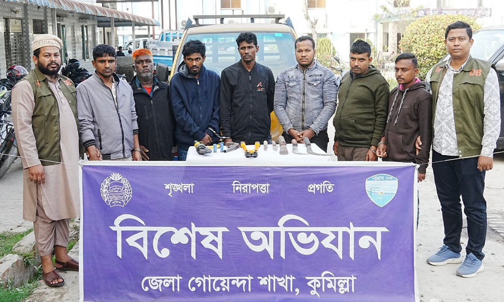 ঢাকা-চট্টগ্রাম মহাসড়কের কুমিল্লার দাউদকান্দি উপজেলার ইলিয়টগঞ্জ বাজার এলাকায় ডাকাতির প্রস্তুতিকালে আন্তঃজেলা সক্রিয় একটি সংঘবদ্ধ ডাকাত চক্রের সর্দারসহ ৭ জনকে গ্রেপ্তার