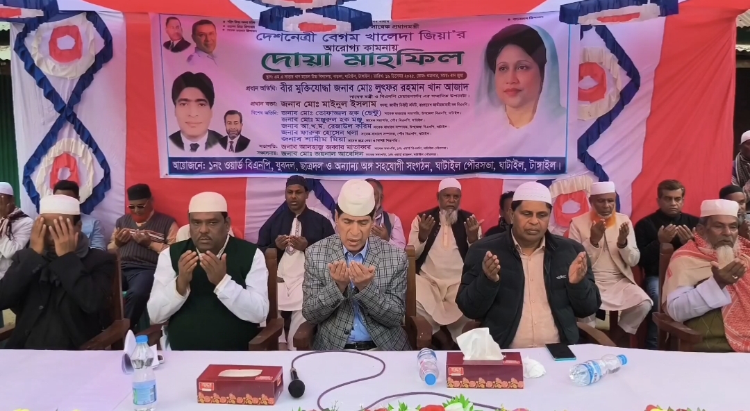 ‎টাঙ্গাইলের ঘাটাইলে পৌর এলাকার ১ নং ওয়ার্ডে বিএনপির সাবেক প্রধানমন্ত্রী বেগম খালেদা জিয়ার আরোগ্য কামনায় দোয়া মাহফিল অনুষ্ঠিত।‎ ‎গতকাল শুক্রবার