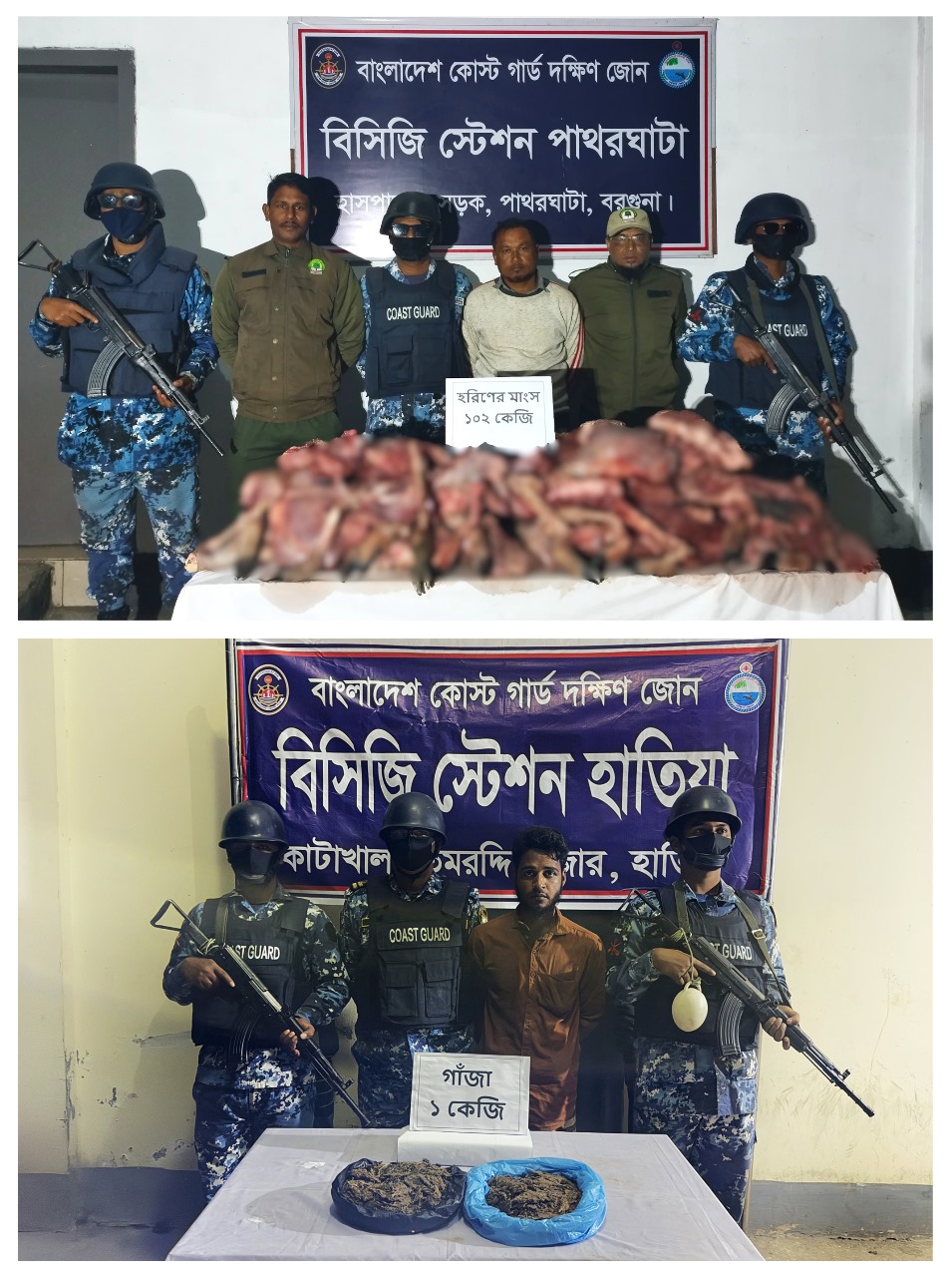 বরগুনা ও নোয়াখালীতে কোস্ট গার্ডের পৃথক ২টি অভিযানে হরিণের মাংসসহ শিকারি এবং গাঁজাসহ এক মাদককারবারিকে আটক করা হয়েছে। রোববার কোস্টগার্ড