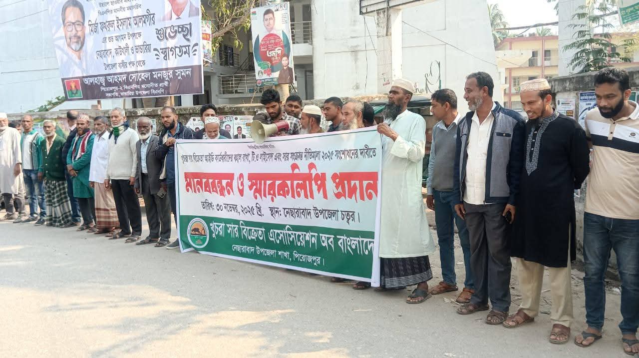 নেছারাবাদ (স্বরূপকাঠী) উপজেলায় খুচরা সার বিক্রেতা আইডি কার্ডধারীদের বহাল রাখা, টি:ও লাইসেন্স ও সার সংক্রান্ত নীতিমালা ২০২৫ সংশোধনের দাবীতে মানববন্ধন