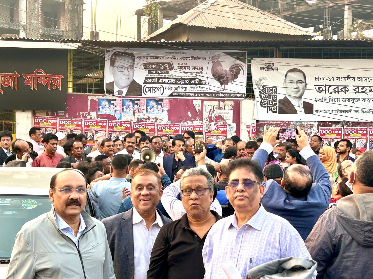 নির্বাচনী এলাকা ঢাকা-১৭ এর মনোনীত প্রার্থী বিএনপি চেয়ারম্যান তারেক রহমানের ধানের শীষ প্রতীকের পক্ষে গতকাল শনিবার অবসরপ্রাপ্ত সরকারি কর্মকর্তাবৃন্দ প্রচারণা