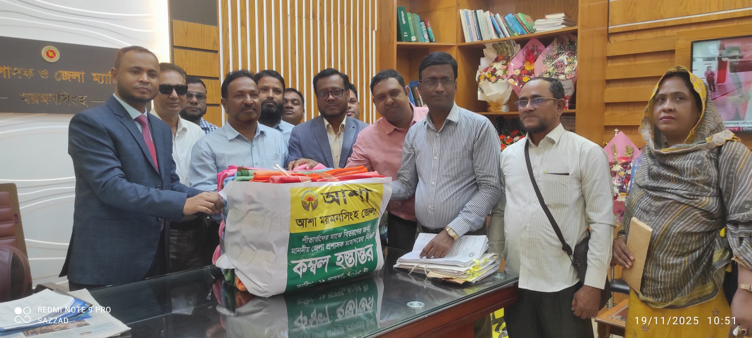 দরিদ্র শীতার্ত মানুষের মধ্যে বিতরণের জন্য আত্মনির্ভরশীল ক্ষুদ্র ঋণদানকারি প্রতিষ্ঠান ‘আশা’র পক্ষ থেকে ময়মনসিংহ জেলা প্রশাসকের কাছে ৪৫০ টি কম্বল