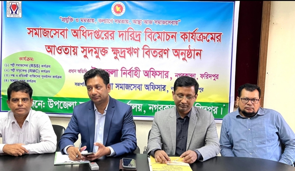 ফরিদপুরের নগরকান্দায় সমাজসেবা অধিদপ্তরের দারিদ্র বিমোচন কার্যক্রমের আওতায় সুদমুক্ত ক্ষুদ্র ঋণের চেক বিতরণ করা হয়েছে। গতকাল বুধবার উপজেলা পরিষদ হলরুমে