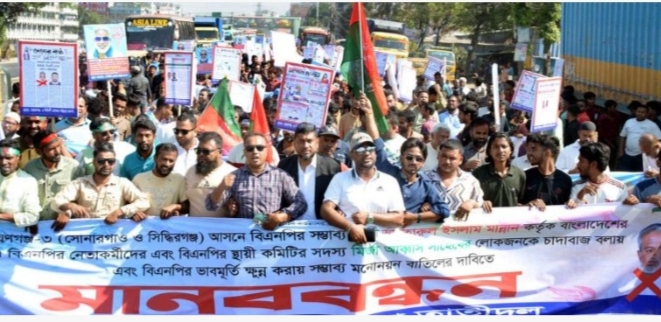 নারায়ণগঞ্জ-৩ (সোনারগাঁও-সিদ্ধিরগঞ্জ) আসনে বিএনপির প্রার্থী আজহারুল ইসলাম মান্নানের মনোনয়ন বাতিলের দাবিতে ঢাকা-চট্টগ্রাম মহাসড়কে মানববন্ধন করেছে সিদ্ধিরগঞ্জের ১-১০নং ওয়ার্ড বিএনপি ও