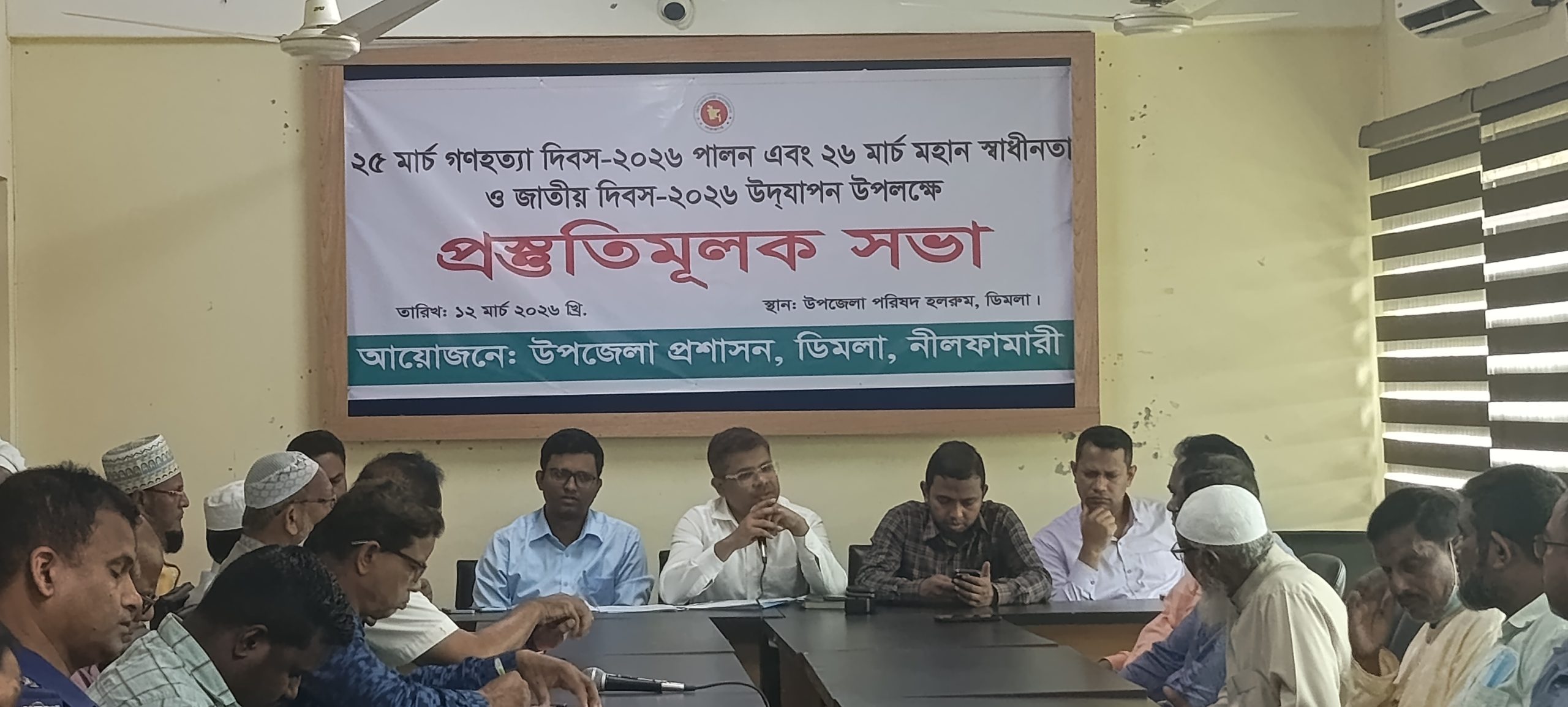 নীলফামারীর ডিমলা উপজেলায় গণহত্যা দিবস ও মহান স্বাধীনতা দিবস যথাযোগ্য মর্যাদায় উদযাপন উপলক্ষে প্রস্তুতিমূলক সভা অনুষ্ঠিত হয়েছে। উপজেলা প্রশাসনের উদ্যোগে
