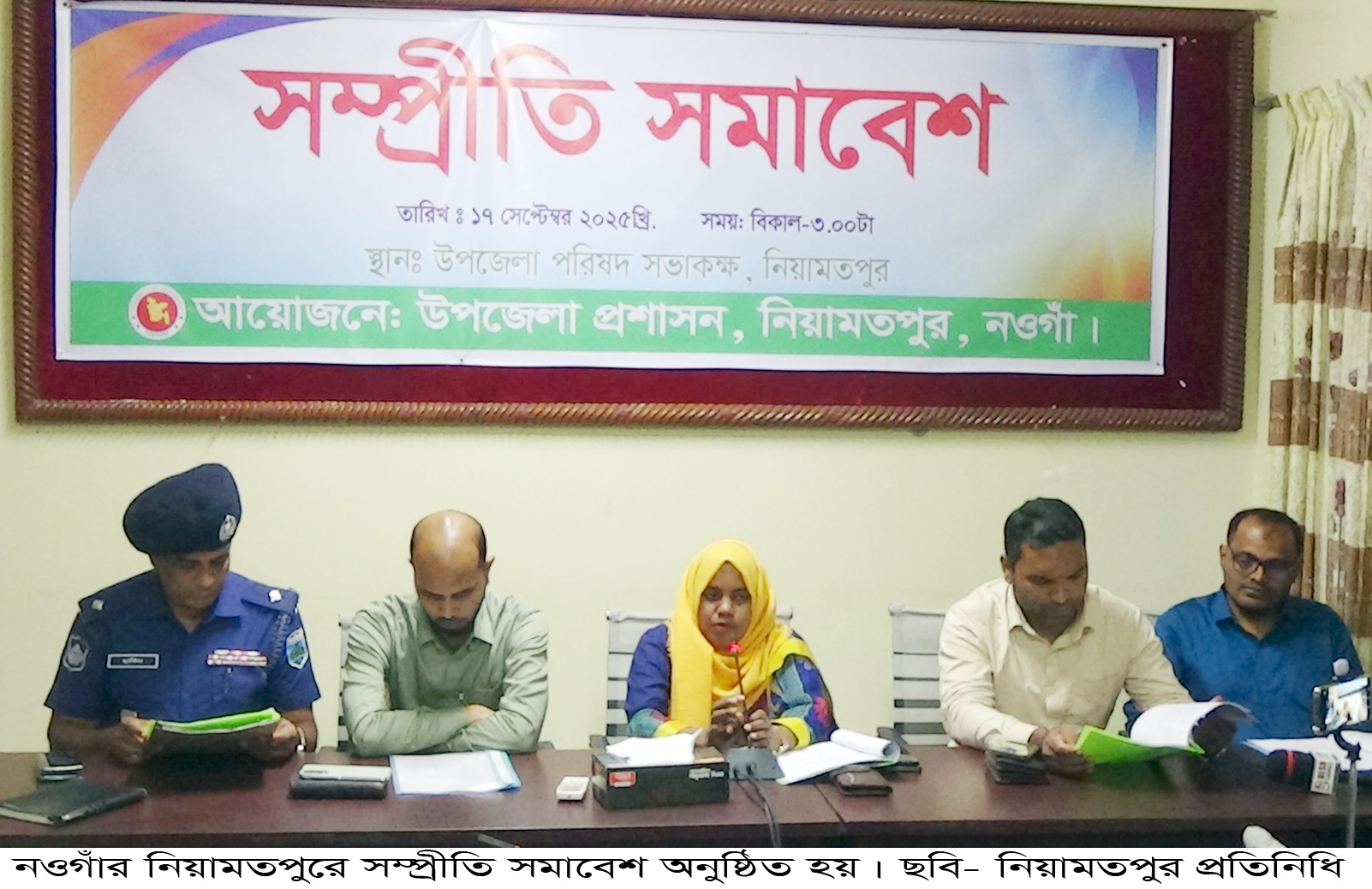 নওগাঁর নিয়ামতপুরে সম্প্রীতি সমাবেশ অনুষ্ঠিত হয়েছে। গতকাল বুধবার ১৭ সেপ্টেম্বর বিকালে নিয়ামতপুর উপজেলা পরিষদ মিলানায়তনে উপজেলা পরিষদের আয়োজনে এই সম্প্রতি
