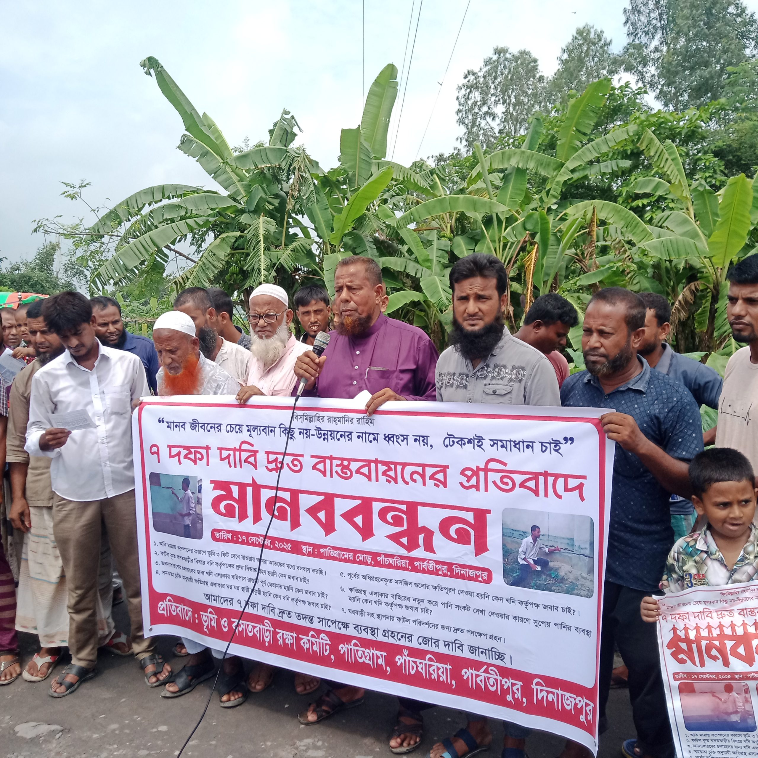 দিনাজপুরের বড়পুকুরিয়া কয়লা খনি এলাকায় ক্ষতিগ্রস্থদের সাত দফা দাবি নিয়ে গতকাল বুধবার সকাল ১১ টা পাতিগ্রাম মোড়ে মানববন্ধন অনুষ্ঠিত হয়েছে।